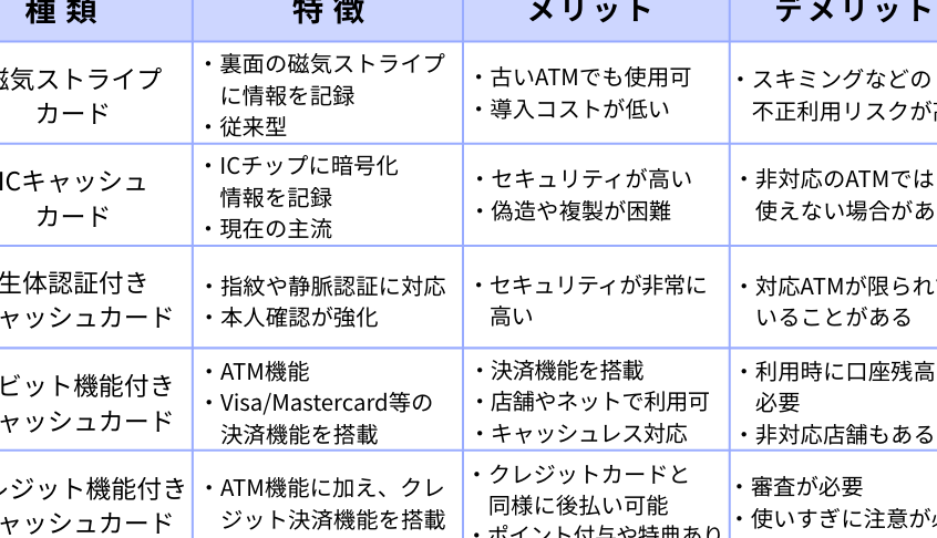 キャッシュカードは、口座情報をもとにATMで現金を引き出すためのカードです。主な役割には、以下の項目が含まれます。