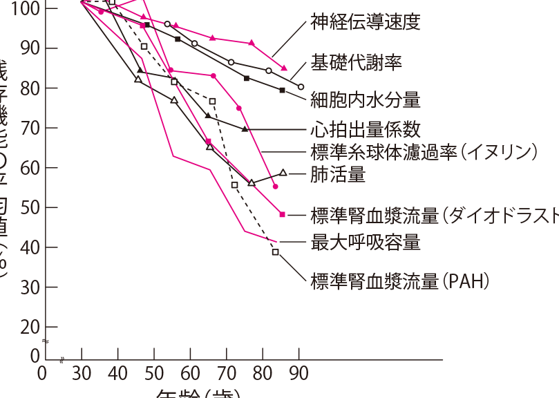 - 筋肉および骨: 筋肉量は年齢と共に減少し、骨密度も低下します。骨折のリスクが高まります。