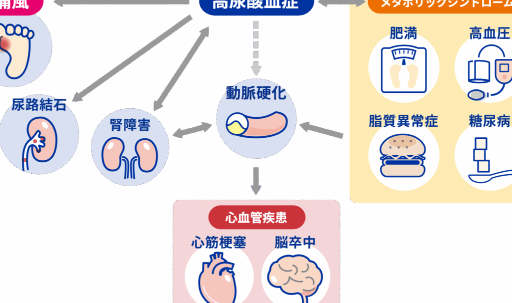 高尿酸血症の発症は、尿酸が結晶化し、関節に蓄積されることに繋がる。結果として、痛風や腎疾患にも関連する。