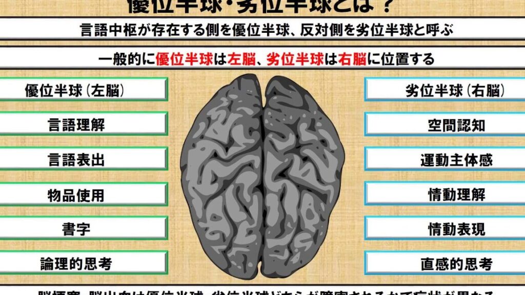 劣位半球は、言語、論理的思考、計算する能力、そして身体の右側の動きを司っています。損傷があると、言語の理解や発話に困難が生じ、例えば、右手の運動機能にも影響が及ぶことがあります。症状は多様で、具体的には以下のようなものが見られます。