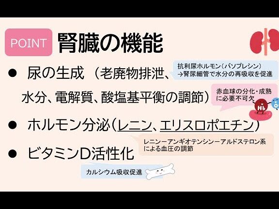 腎臓は私たちの健康を支える重要な器官であり、多くの機能を果たしています。特に、体液のバランス維持と代謝産物の排出は、腎臓の主な役割です。このセクションでは、これらの機能について詳しく説明します。