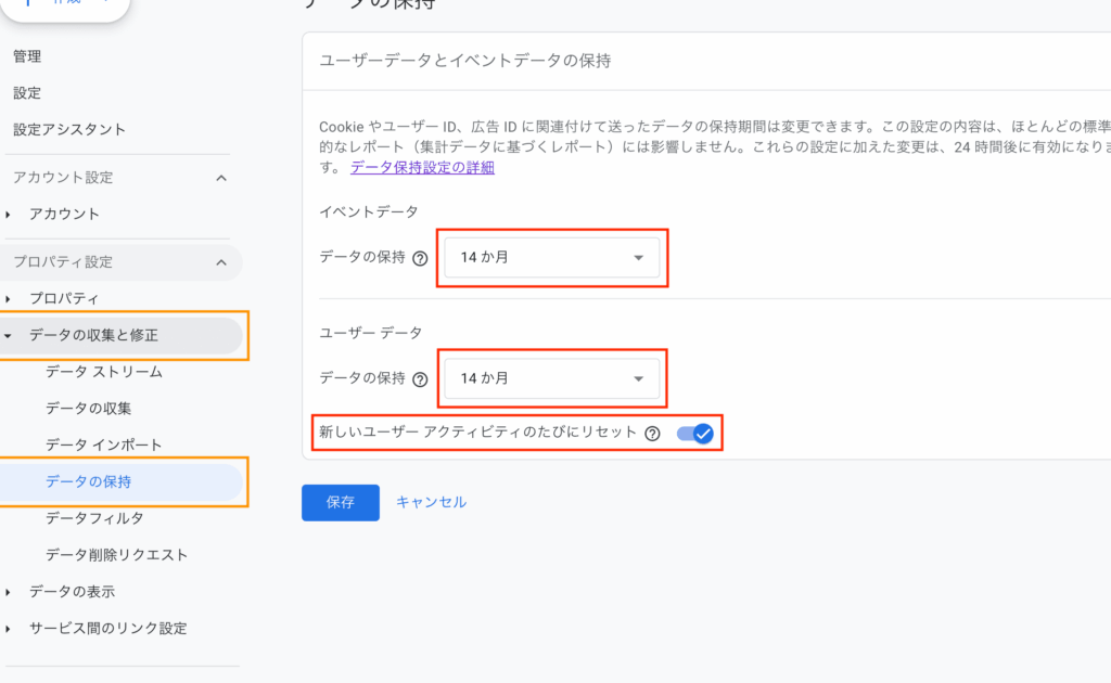 - 保存期間を設定: ユーザーデータまたはイベントデータの格納期間を選びます。ユーザーデータは最大50ヶ月、イベントデータは最大14ヶ月の期間から選択可能です。