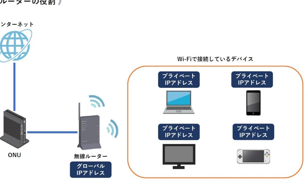 - プライベートIPアドレス: LAN内で使用されるアドレス。インターネット上では非表示。