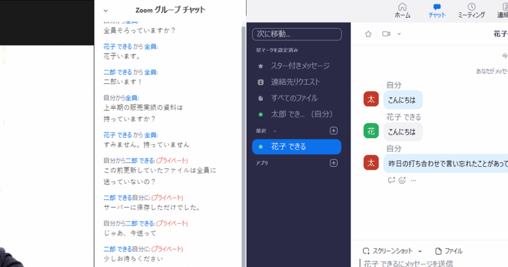 - グループチャット:ミーティング参加者全員と情報を共有。