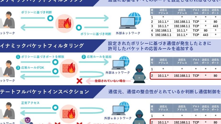 - ステートフル検査:セッション情報を維持し、パケットが正当な通信の一部であるか確認する。