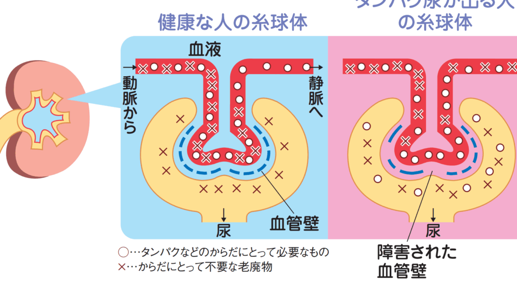 腎機能低下が進行すると、腎臓の糸球体が正常に機能しなくなる。その結果、血液中の蛋白質が尿中へ漏れ出す。このメカニズムには以下の要因が関与している。