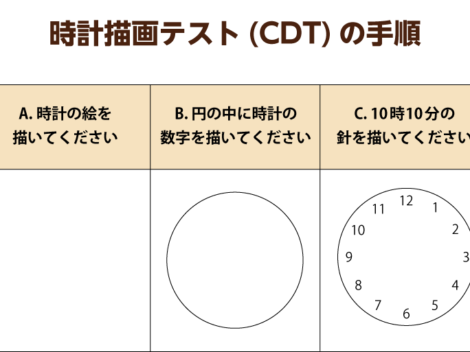- 時計描画テスト: 注意力や実行機能を評価する簡易な方法です。このテストでは、被験者に時計を描かせます。