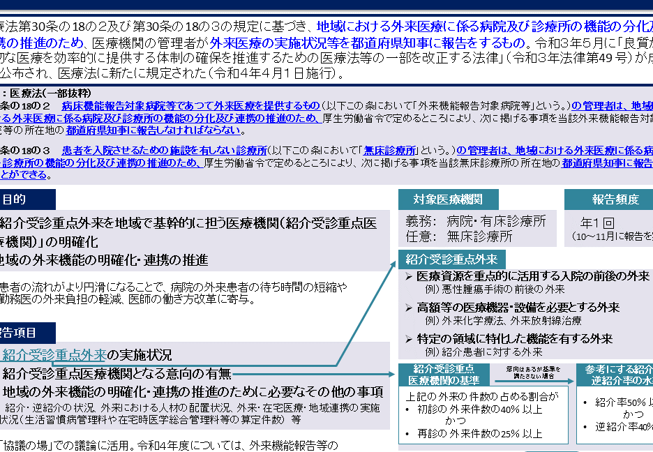 外来機能報告制度は、特定の日付から実施されており、医療機関の外来機能を明確にする役割を果たしています。この制度の導入は、医療の質向上を目指しており、透明性の確保にも寄与しています。