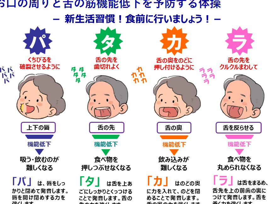 高齢者にとって、口の動きが衰えることは日常生活に大きな影響を与えます。パタカラ体操は以下のような効果があります。