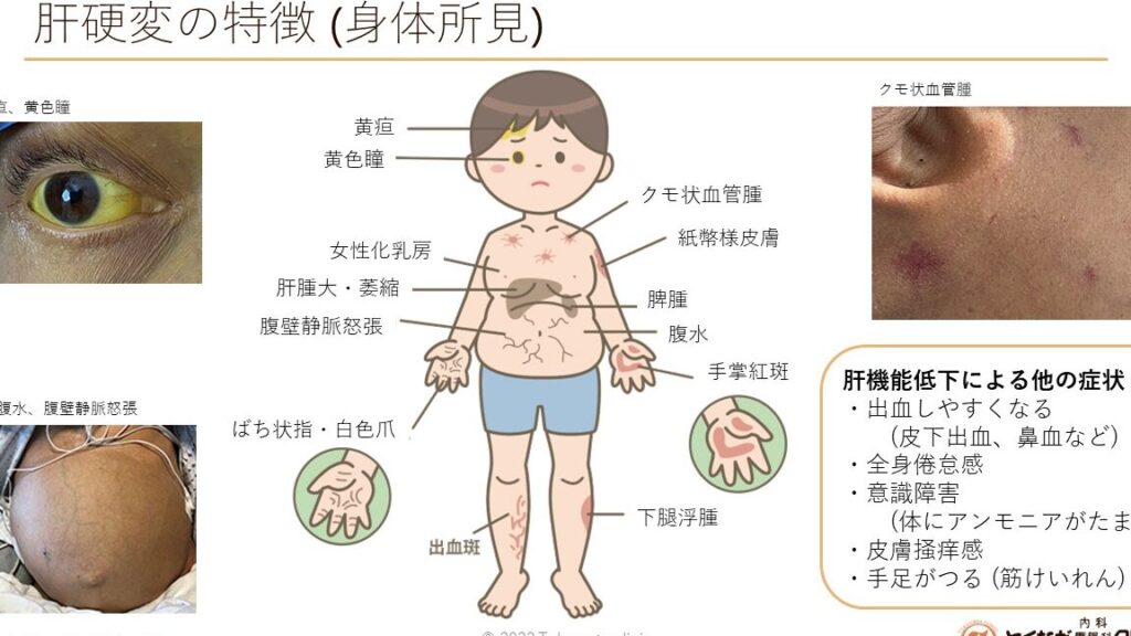 - 意識障害:肝性脳症が進行することで、意識の混濁が見られることがある。