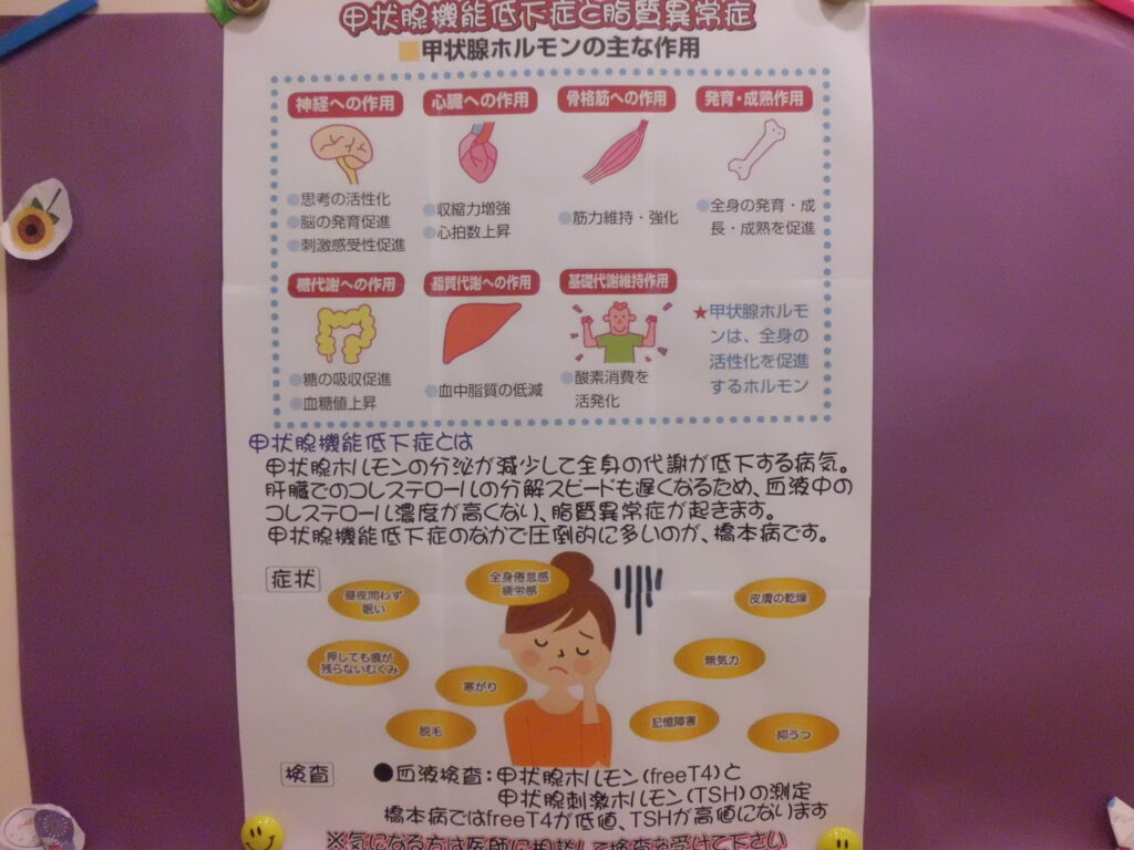 甲状腺ホルモンは代謝調節に重要です。ホルモンの不足により、脂質の代謝が遅くなり、以下の現象が見られます: