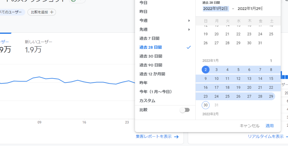 期間設定機能は、特定の開始日と終了日を設定することで、レポートを必要に応じてカスタマイズできます。この機能を使うと、特定の期間におけるデータの変化を追跡できます。例えば、昨年の同時期と今年の状況を比較することで、パフォーマンスの向上や低下を直感的に把握できます。また、他の要因を除外できるため、より正確な分析が可能です。