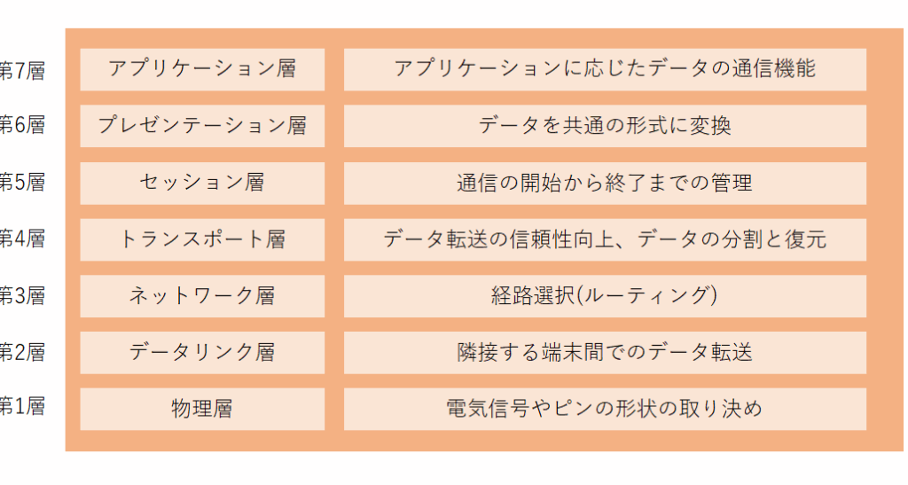 - 物理層: データの物理的な伝送を担当し、信号を電気的または光学的に変換します。