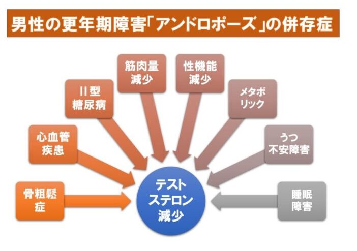 男性において、加齢によるテストステロンの減少が顕著です。具体的には、30歳を過ぎると毎年約1%の割合でテストステロンのレベルが低下します。このホルモンの減少は、性欲の低下や精子の質の低下をもたらすことがあります。さらに、中高年層の男性には以下のような症状が報告されています。