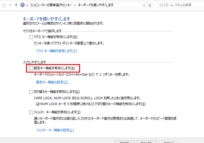 - 固定キーを有効にする: 「固定キーを有効にする」にチェックを入れます。これにより、複雑な操作を簡略化できます。
