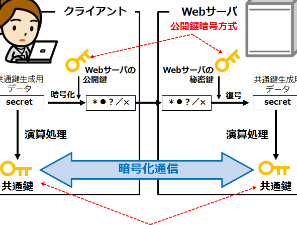 - 鍵の交換: サーバーからクライアントに公開鍵が送信され、クライアントはその鍵を使ってデータを暗号化します。