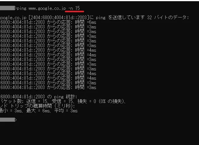 例えば、ping google.comと入力すると、Googleのサーバーに対してエコー要求を送信し、応答を待ちます。このコマンドにより、ネットワークの可用性や応答速度を即座に確認できます。