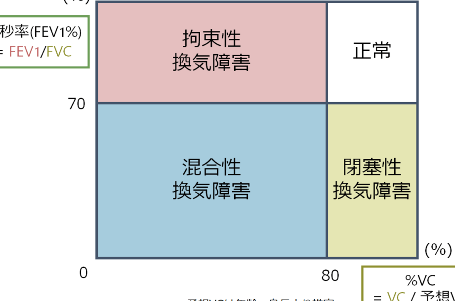 - FEV1/FVC比:0.7より大きいことが望ましいです。