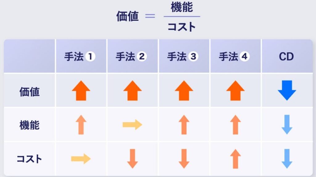 製品やサービスの価値を高めるためには、機能、コスト、品質のバランスを取ることが重要です。このアプローチは、全体最適を目指し、顧客満足度を最大化しつつ、コスト効率を維持することが求められます。
