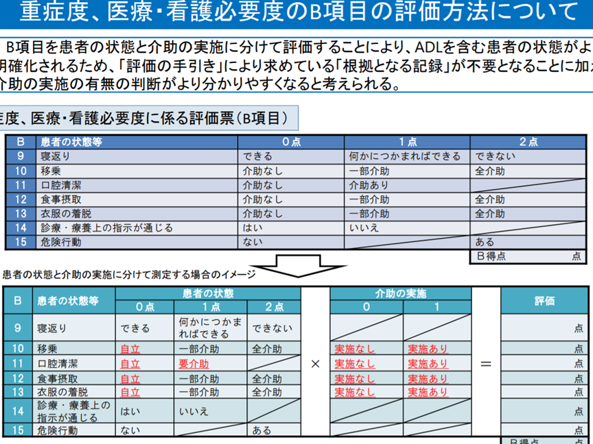点数化のシステムは、看護必要度を具体的に評価する手段です。以下に、具体的な評価項目や点数配分について示します。