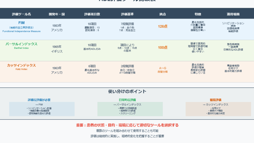 FIMは他の評価法と比べて、患者の自立度評価において独自の特徴を持ちます。これにより、幅広い状況で効果的に利用されています。