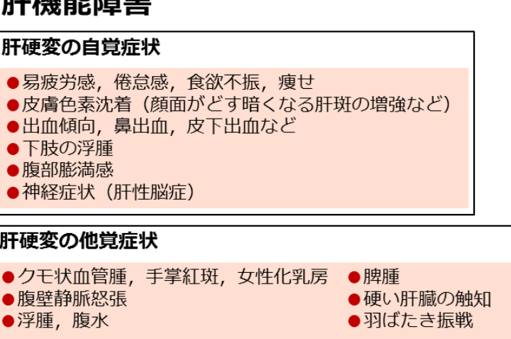 肝臓の機能不全は、肝臓が正常に働かない状態を指します。肝臓は、代謝、解毒、合成、貯蔵といった多数の重要な役割を担っており、機能不全が起こるとこれらのプロセスに影響を与えます。具体的には、以下のような症状が現れることがあります。